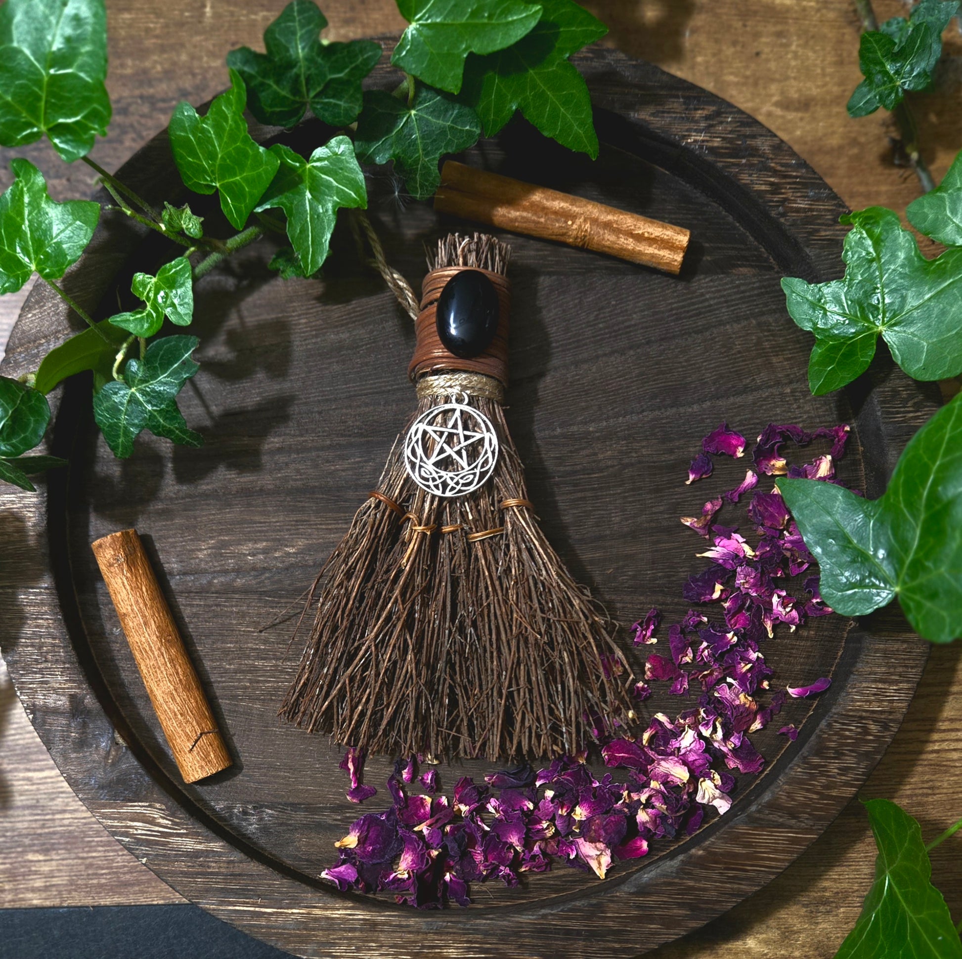 Celtic Pentacle Witch's Broom, Crystal Witchy Altar Besom with Black Onyx