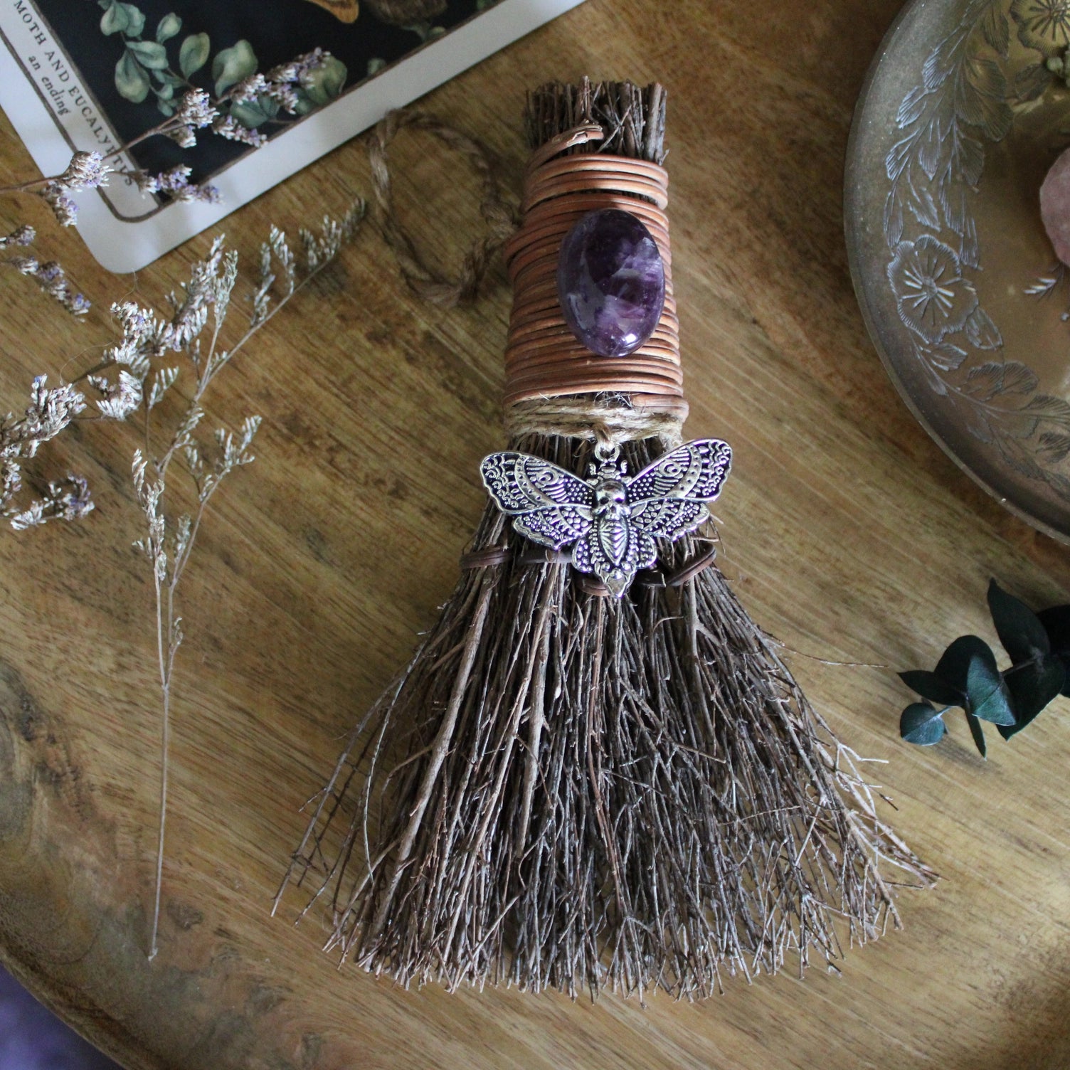 Death's Head Moth Witch's Broom, Crystal Witch Altar Besom with Amethyst